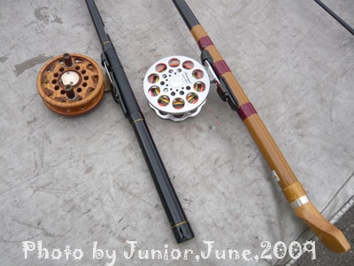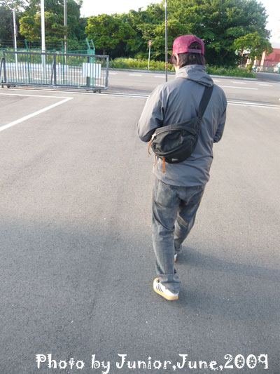 どうやらリールから道糸をまき散らしながら歩いて来てしまった模様。糸を回収しに巻きながら戻るYSK,,,