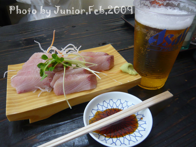 寒ブリの刺身(単品,¥600)と勿論生ビール,,,(¥500)至福の瞬間。笑